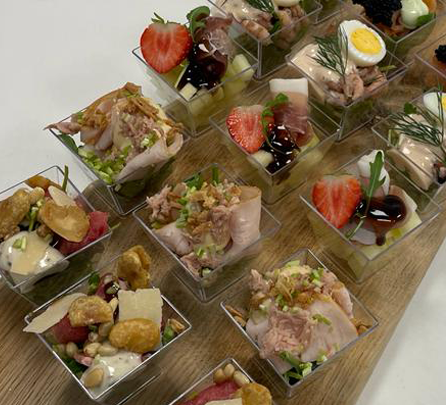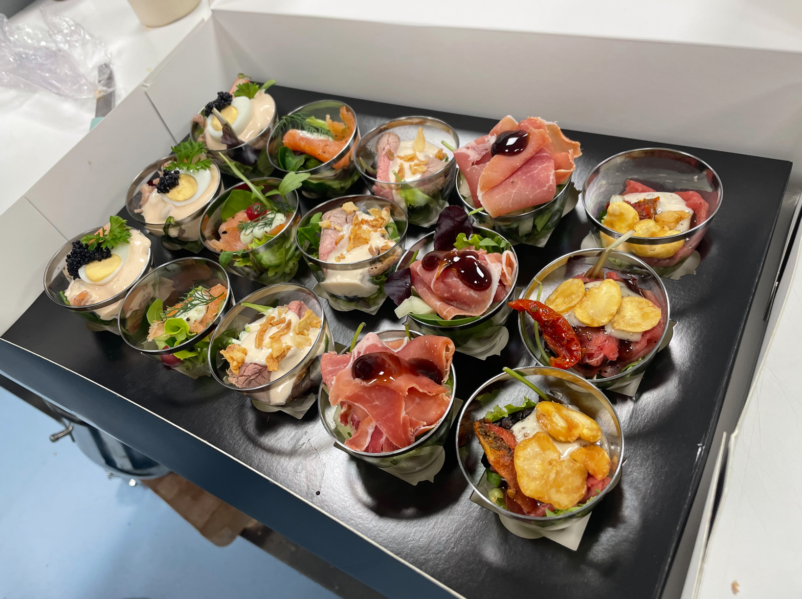 Deze smaakvolle box bevat een selectie van culinaire hoogstandjes, waaronder gerookte zalm, vitello tonato, hollandse garnalen, serranoham met meloen en runder carpaccio.